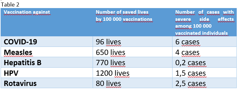 Table 2 shows an overview of vaccinations and the lives saved per 100,000 vaccinations, as well as the average number of side effects observed among 100,000 vaccinated individuals6-12.